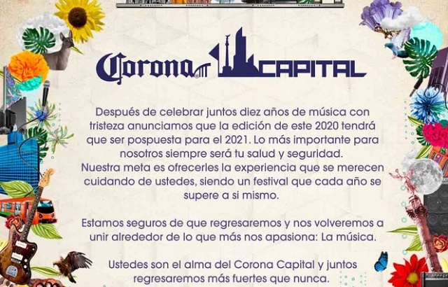 La cuenta oficial del Corona Capital anunció en sus redes sociales que el festival quedará pospuesto hasta el 2021 debido a la pandemia de Covid y a las cifras altas que existen actualmente en el país.