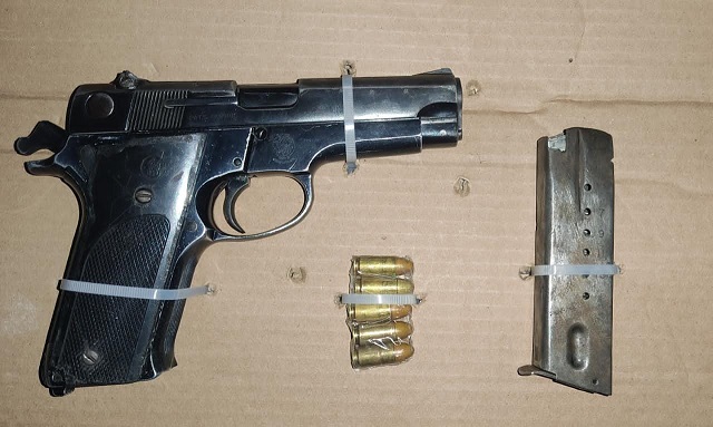 Al indiciado le fue encontrada entre sus pertenencias una pistola calibre .9 mm., abastecida con cinco cartuchos útiles, por lo que fue puesto a disposición de la autoridad competente a efecto de resolver su situación jurídica.
