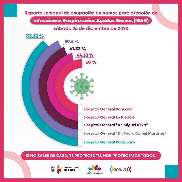La Secretaría de Salud de Michoacán (SSM), reitera el llamado a la población a no relajar medidas preventivas contra COVID-19, ya que el reporte de las camas de cinco hospitales reconvertidas para la atención de Infecciones Respiratorias Agudas Graves (IRAG), es del 33.33 al 50 por ciento.