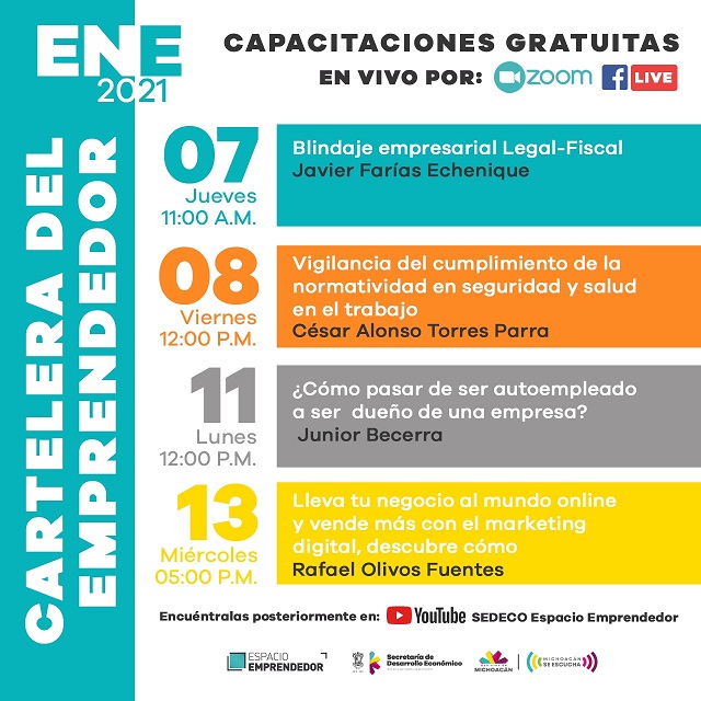 Con una cartelera que incluye 13 cursos sobre temas enfocados al fortalecimiento empresarial, en enero inicia la capacitación virtual y gratuita que ofrece la Secretaría de Desarrollo Económico (Sedeco), a través de Espacio Emprendedor.