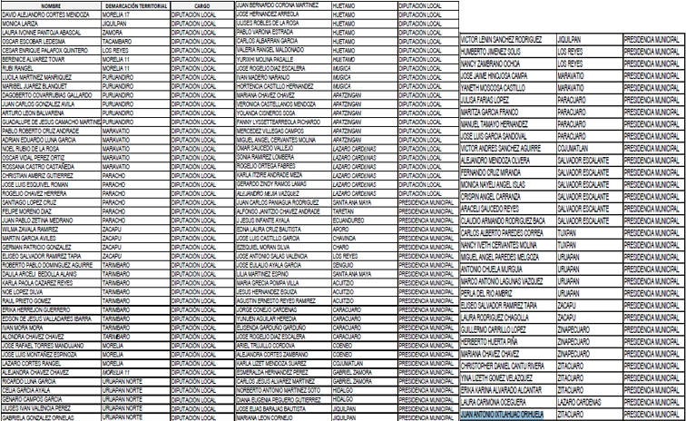 En el Partido Revolucionario Institucional ya se definió y la “repartición” quedó así: Distrito 01 de Lázaro Cárdenas, ISABEL SÁNCHEZ GALVÁN actual regidora de Múgica; por el Distrito 07 de Zacapu, la alcaldesa de Jacona ADRIANA CAMPOS HUIRACHE; por el Distrito 08 de Morelia, el legislador local EDUARDO “EL BEBÉ” ORIHUELA ESTEFAN y por el Distrito 12 de Apatzingán, IRMA VARGAS MORALES actual síndica de Tepalcatepec.