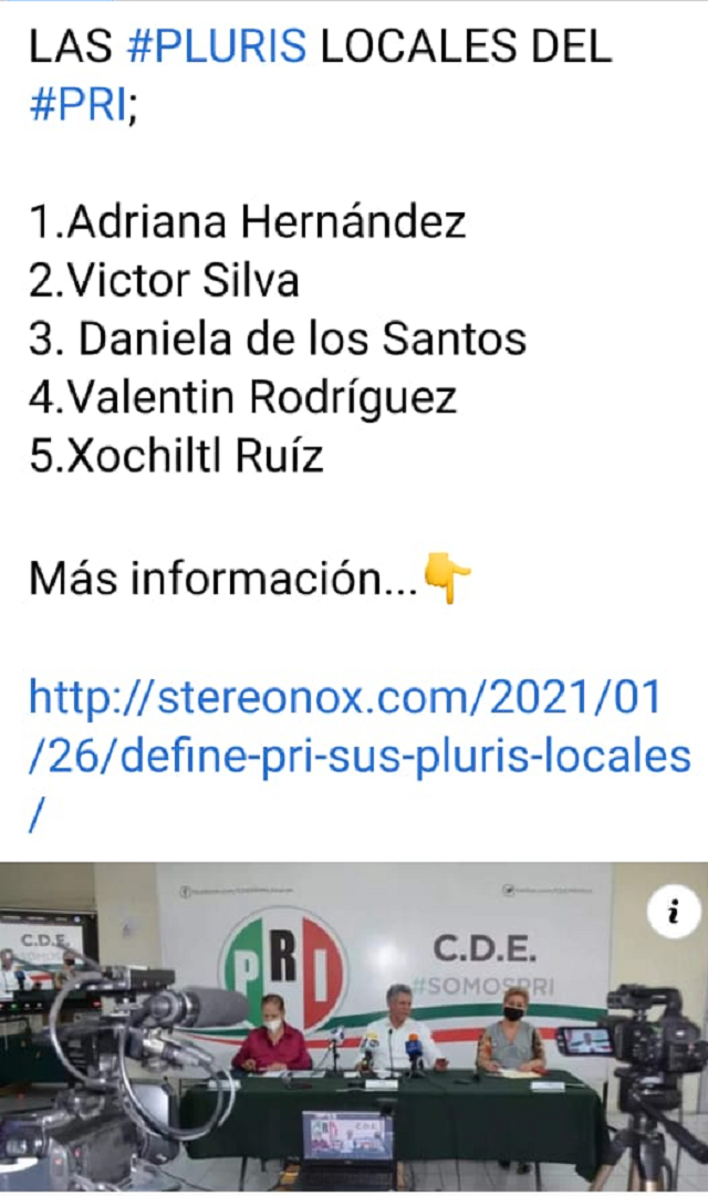 La tarde de este martes, el portal de noticias de una estación de radio de la ciudad de Jiquilpan, esparció la especie de una presunta “lista” de candidatos plurinominales a diputado local del Partido Revolucionario Institucional, la que se puede consultar en la siguiente liga: http://stereonox.com/2021/01/26/define-pri-sus-pluris-locales/?fbclid=IwAR3EKkjEBRFMl9naVosJfX8tmCO4gFw5HvFsWjh2Exrn5CQCiqlmdLsUFgA