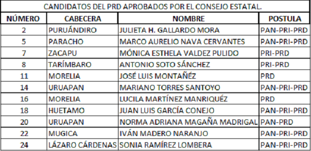 Así las cosas, la lista de candidatos a diputado por la vía plurinominal la encabeza la actual directora del DIF estatal ROCÍO BEAMONTE ROMERO, en el número 2 se nominó al actual dirigente estatal del PRD VÍCTOR MANUEL MANRIQUEZ GONZÁLEZ; en el número 3 se nominó a la actual coordinadora de comunicación social del gobierno estatal JULIETA LÓPEZ BAUTISTA.