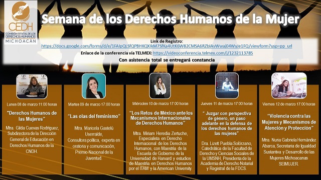 Como parte de las actividades en el marco del Día Internacional de la Mujer, la Comisión Estatal de los Derechos Humanos (CEDH) en Michoacán, realizará la Semana de los Derechos Humanos de la Mujer del lunes 08 al viernes 12 de marzo.