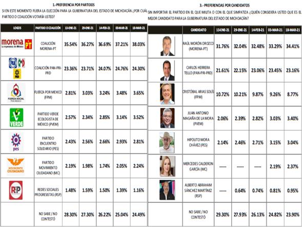 Para el proceso electoral que culmina en su parte electiva el próximo domingo 6 de junio, nuestra encuestadora inició mediciones desde el mes de enero al mes de noviembre del 2020, con el objeto de visualizar el desarrollo, crecimiento o retroceso de los diversos actores políticos que aspiraban a conquistar la candidatura al gobierno de Michoacán y sus respectivos partidos políticos.
