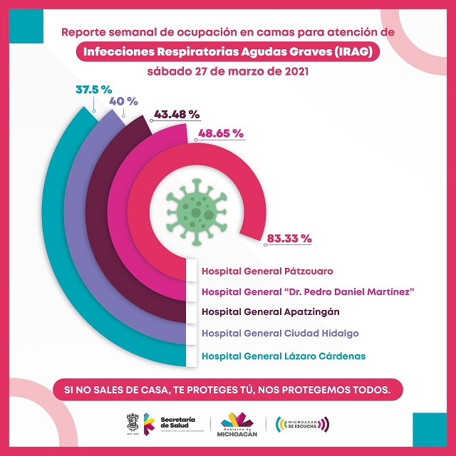 La Secretaría de Salud de Michoacán (SSM), informa que las camas reconvertidas en sus unidades médicas para la atención de Infecciones Respiratorias Agudas Graves (IRAG) presentan la siguiente ocupación: