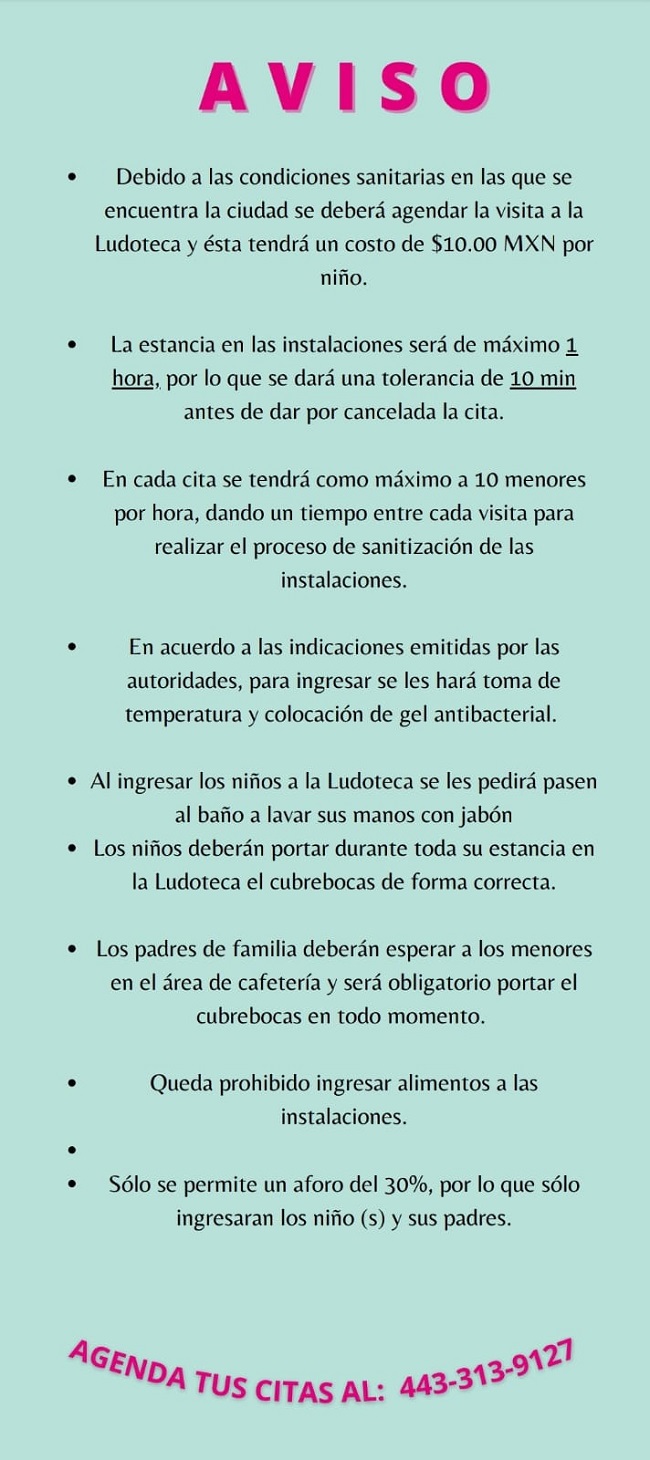 “Se permitirá un aforo de niños del 30 por ciento de la capacidad del lugar, recibiremos grupos de siete niños por un tiempo máximo de cuatro horas, por lo que se deberá realizar una cita anticipada, además esto nos permitirá tener el control de la sana distancia y la sanitización entre cada grupo”, comentó Corona González.