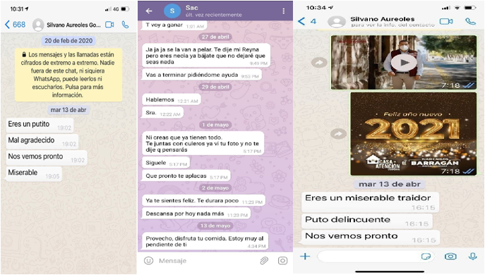 En su exposición, RAMÍREZ BEDOLLA mostró imágenes de “capturas de pantalla” de teléfonos celulares, en los que se puede leer textos en los que presuntamente el titular del ejecutivo escribe palabras soeces en contra del destinatario, solo que no demostró que el teléfono del que se emitieron los textos publicitados, fuera el personal de AUREOLES CONEJO.