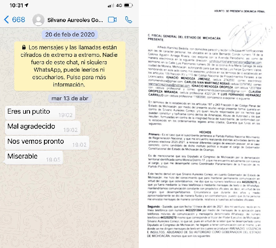 “Por lo que, derivado de los hechos, por este medio se hace del conocimiento de esta Fiscalía General del Estado de Michoacán, que se teme no solo por la integridad física del de la voz, sino por mi vida puesto que las AMENAZAS, INSULTOS Y ABUSO DE AUTORIDAD son muy claros y expresos en dichos mensajes vía Whatsapp que fueron recibidos, tal y como se consta en las imágenes de las cuales se desprenden lo hechos aquí denunciados.”