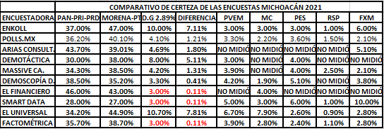 Durante el proceso electoral 2020-2021, un número importante de casas encuestadoras midieron el comportamiento y desarrollo de las campañas electorales, así como el crecimiento o decrecimiento de los diversos candidatos a gobernador del estado de Michoacán, en las preferencias electorales, que participaron en dicho proceso que culminó en su parte electiva el pasado domingo 6 de junio.