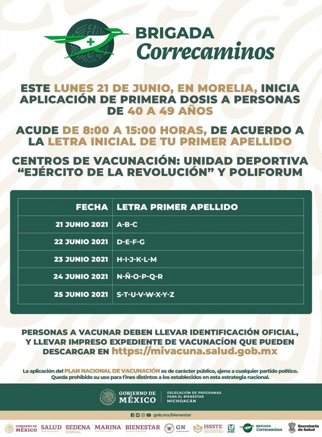 Es importante mencionar que las personas de 40 a 49 años que acudan por el biológico deberán presentar su expediente de vacunación que se puede descargar en el portal http://mivacuna.salud.gob.mx/ e identificación oficial. El Gobierno de Morelia reitera su apoyo a estas acciones en las distintas sedes y que se tenga una jornada de vacunación tranquila y segura para la ciudadanía, así como para el personal de instituciones de salud participantes tanto del estado como de la federación.