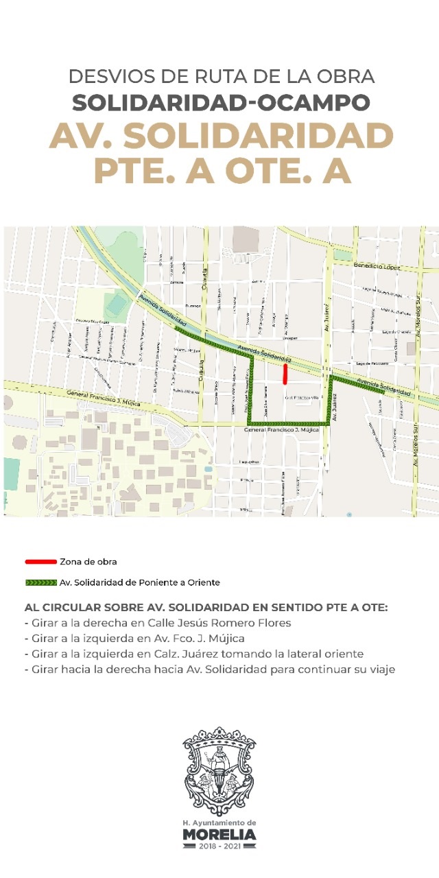 En cambio, sí se transita por av. Solidaridad poniente-oriente deberá el automovilista girar a la derecha en la calle Jesús Romero Flores; doblar a la izquierda en av. Francisco J. Mújica; Doblar a la izquierda en Calzada Juárez y tomar la lateral oriente; también podrá girar a la derecha hacia Av. Solidaridad para continuar con su viaje.