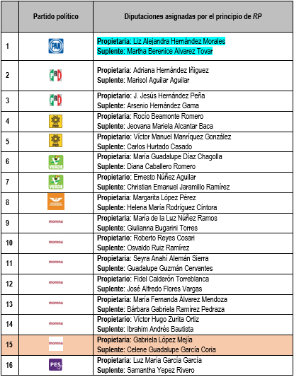 En ese tenor, la nueva configuración de la asignación de la diputaciones por el principio de representación proporcional quedarían de la siguiente manera, en número y persona asignada: