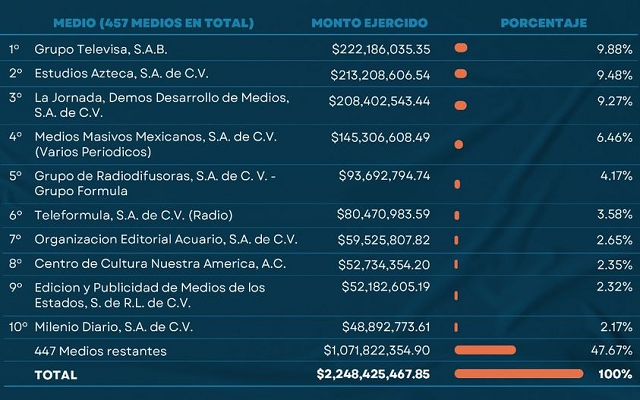 Para el 2020, el gobierno que promueve la 4T, redujo su gasto en publicidad a solo 2 mil, 248 millones, 425 mil, 467.85 pesos, pero no cambió a su grupo de preferidos, pues Grupo Televisa, Estudios Azteca y La Jornada, volvieron a llevarse la mayor parte del botín con el 28.63% del presupuesto y junto con otro 7 medios de comunicación, se llevaron el 52.33%, el resto, 47.67% se repartió entre 447 medios de todo el país.