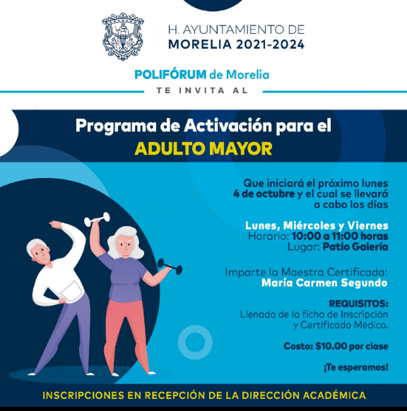 Con el objetivo de brindar nuevas alternativas para mejorar la calidad de vida de la población que vive en el norte de la ciudad, el Polifórum de Morelia arrancará el próximo lunes con el programa de Activación para el Adulto Mayor.