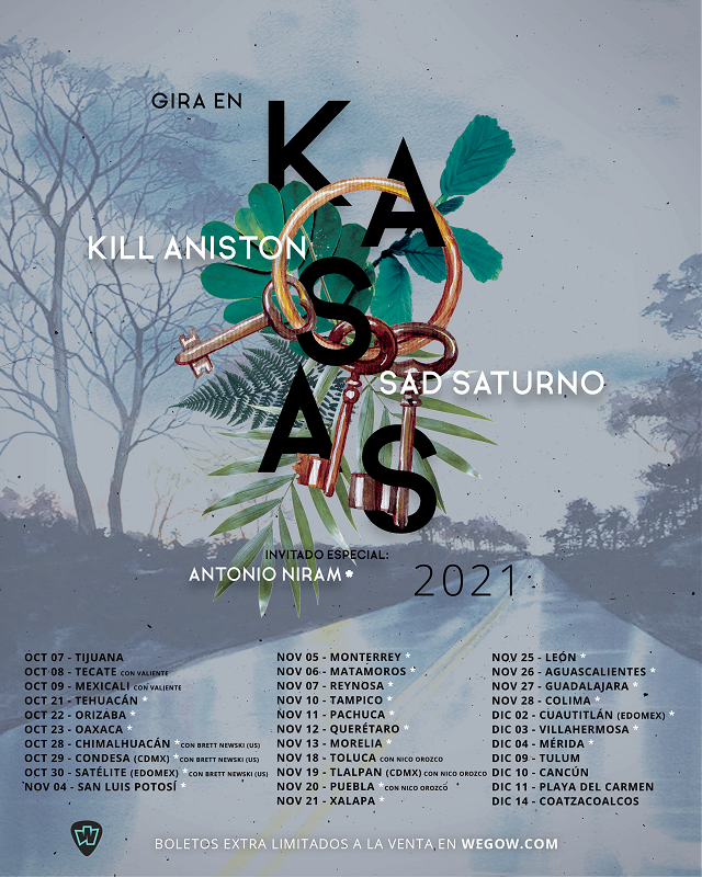 La agrupación mexicana Kill Aniston liderado por Josue Guijosa anunció 32 fechas confirmadas este 2021 en su proyecto independiente llamado Gira en KAsas, donde se ha dedicado a tocar por 9 años en las casas de los fans en distintos puntos de la República Mexicana, en esta ocasión estará acompañado de Sad Saturno y Antonio Niram, y abridores en algunas fechas como Valiente, Brett Newski (EU), Nico Orozco.