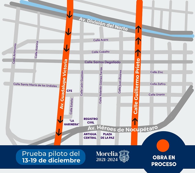 Agregó que esta medida se realizará del 13 al 19 de diciembre y abarcará desde avenida División del Norte (Río Grande) hasta avenida Héroes de Nocupétaro, quedando las calles Guadalupe Victoria en sentido norte-sur y Guillermo Prieto en sentido sur-norte; en el caso de las rutas Crema 1, Crema 2, Guinda 1, Rosa 1, Rosa 2, Rosa 2-B, Camión Ruta 2 y Camión Alberca, modificarán su trayecto temporalmente.