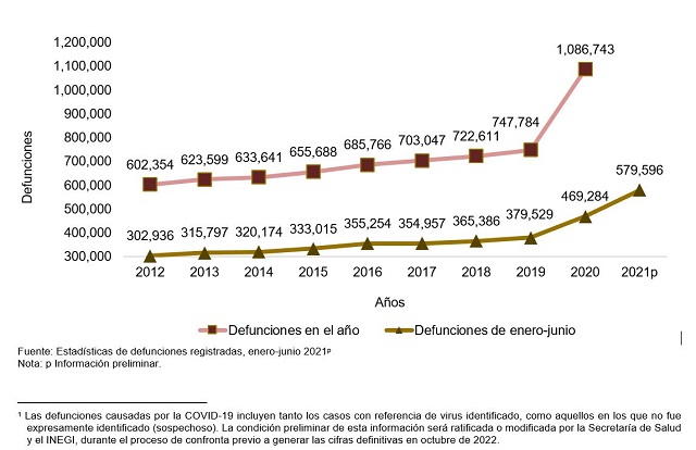 Entre enero y junio de 2021 se registraron de forma preliminar 579,596 defunciones totales. Enero fue el mes que presentó el mayor número de defunciones registradas con 28.1 %, seguido de febrero y marzo con 19.9% y 16.1%, respectivamente.