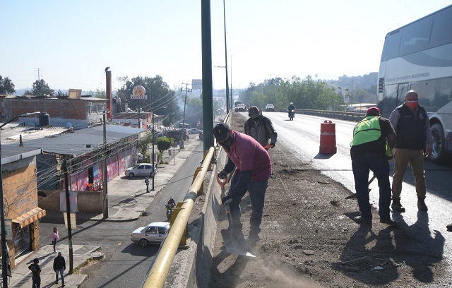 En los trabajos que se realizan participa personal en campo, con una retroexcavadora, un camión de volteo y barredoras para el retiro de maleza que ha crecido en la tierra acumulada durante 7 años, por lo que se reitera manejar con precaución y bajar la velocidad ante la reducción de carriles en lo que se atiende la limpieza.