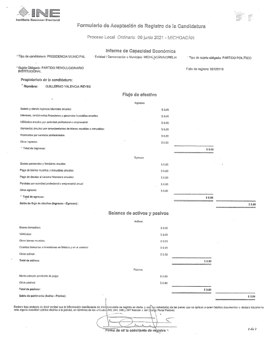 En síntesis, el señor GUILLERMO VALENCIA REYES, de acuerdo a su declaración hecha al Instituto Nacional Electoral, con motivo de la aceptación de su candidatura a la presidencia municipal de Morelia postulado por el Partido Revolucionario Institucional en el proceso electoral que culminó el 6 de junio del 2021, es una persona sin recurso económico alguno, ni ningún bien, es una persona pobre, prácticamente, en la indigencia. ¿De qué ha vivido?