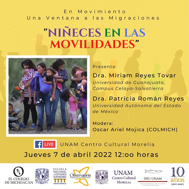 En el marco del ciclo: En Movimiento, una ventana a las migraciones, se realizará una mesa de diálogo titulada “Niñeces en movilidades”, en la cual se abordará y se analizará cómo ha sido el fenómeno de la migración en la niñez con la presencia de dos especialistas en el tema, Dra. Patricia Román Reyes, profesora-investigadora de la Universidad Autónoma del Estado de México; y Dra. Miriam Reyes Tovar, profesora-investigadora de la Universidad de Guanajuato, Campus Celaya-Salvatierra.