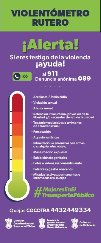 Como parte del Programa de Prevención, Atención y Sanción de la Violencia de Género en el Sistema de Servicio de Transporte Público de Michoacán, el cual desarrolló la Secretaría de Igualdad Sustantiva y Desarrollo de las Mujeres Michoacanas (Seimujer), se procederá en próximos días, a la pega de Violentómetros Ruteros en las unidades de transporte público de Morelia, con apoyo del sector.