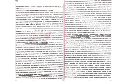 Solo que, al conocerse el texto del polémico poder, se puede ver, que en efecto, ADRIANA HERNÁNDEZ ÍÑIGUEZ en su calidad de presidenta de la mesa directiva, es la representante legal del congreso y por lo tanto, tiene la potestad de otorgar poderes a abogados al servicio del congreso para efectuar trámites y representar al congreso en todo tipo de pleitos, civiles, mercantiles, penales y laborales entre otros.