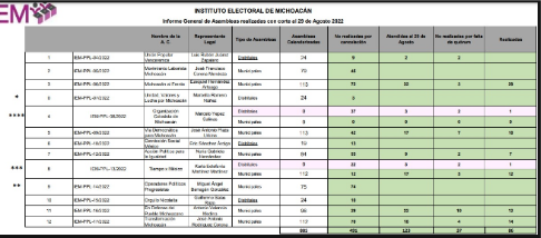 Con el mismo número, es decir 12 asambleas realizadas está la agrupación En Defensa del Pueblo Michoacano, con 29 canceladas por diversas razones y 10 canceladas por falta de quorum; le sigue la agrupación Democracia para Michoacán del tristemente célebre ANTONIO “EL PATO” PLAZA con 10 asambleas realizadas con 42 asambleas canceladas por diversas razones y 7 por falta de quorum.