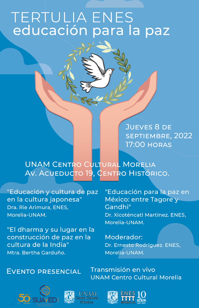 Rie Aimura de la ENES-UNAM Morelia presentará el tema “Educación y cultura de paz en la cultura japonesa”; Bertha Garduño, “El dharma y su lugar en la construcción de paz en la cultura de la India”; y Xicoténcatl Martínez de la ENES-UNAM Morelia “Educación para la paz en México: entre Tagore y Gandhi”.