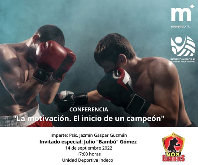 Bajo el slogan “Motivación, el inicio de un Campeón”, el Club de Box Guerreros, en coordinación con el Gobierno de Morelia, vía el Instituto Municipal de Cultura Física y Deporte (Imcufide), realizará una charla de psicología encabezada por Jazmín Gaspar Guzmán, misma que habrá de celebrarse el miércoles 14 del presente mes, en punto de las 17:00 horas, en la Unidad Deportiva Morelos-INDECO.