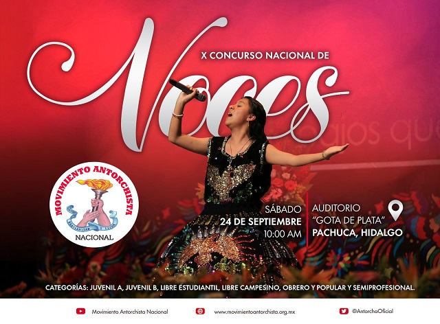 El Movimiento Antorchista Nacional, a través de su Comisión Nacional Cultural, realizará el X Concurso Nacional de Voces 2022 el próximo sábado 24 de septiembre a las 10 de la mañana, en el Auditorio “Gota de Plata”, en la ciudad de Pachuca, Hidalgo. Un centenar de artistas, representantes de todos los estados y que previamente compitieron en encuentros regionales acudirán a este evento para mostrar el talento del pueblo mexicano con canciones de la música popular mexicana y boleros de grandes cantautores y compositores de México y Latinoamérica.