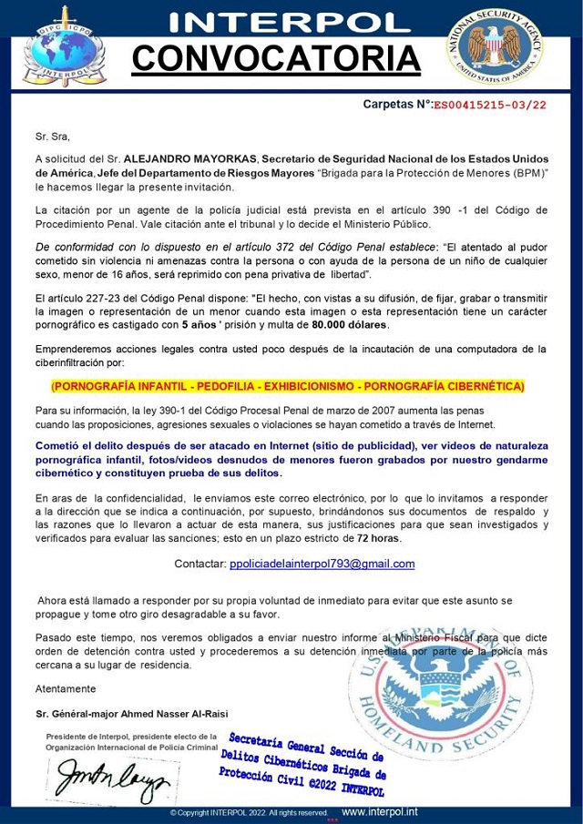 En apoyo a las autoridades estadounidenses, la FGE informa que la acción ilícita consiste en el envío de un comunicado supuestamente firmado por INTERPOL, mediante el cual se les hace saber a usuarios de la red, de la existencia de una investigación en curso por la incautación informática de pornografía infantil, pedofilia, exhibicionismo, ciberpornografía y tráfico sexual.