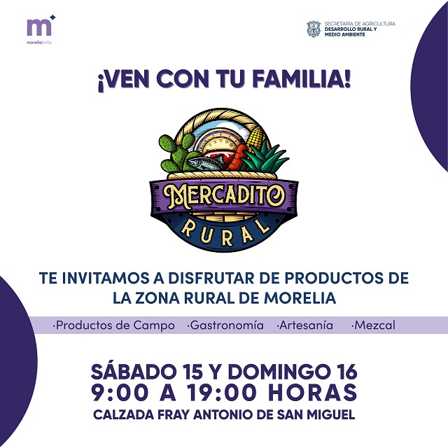 Mercadito Rural, contará con la asistencia de más de 80 productores de las 14 tenencias de Morelia, quienes expondrán productos de la mejor calidad y al mejor precio, como artesanías, molcajetes de San Nicolás de Obispo, piezas de barro y catrinas de Capula, mezcal de San Miguel del Monte, mole de Santa María de Guido, pan de Tiripetío, miel, fruta y demás materia prima que ofrece la zona rural de Morelia.