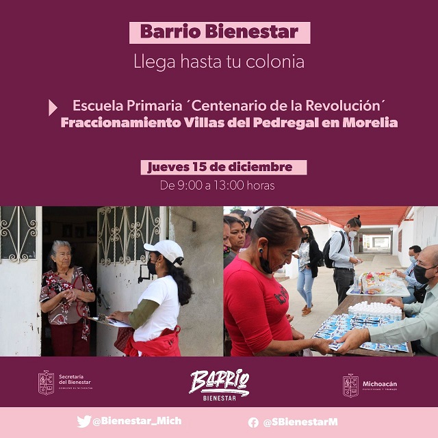 El Fraccionamiento Villas del Pedregal será la sede de la última jornada de intervención comunitaria por parte de las brigadas de Barrio Bienestar, así lo anunció Carolina Rangel Gracida, secretaria del Bienestar (Sedebi) del Gobierno de Michoacán.