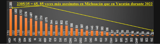 De los 32 estados del país, 6 concentran casi la mitad o el 49 % de los homicidios: Guanajuato, Michoacán, Baja California, Estado de México, Jalisco y Chihuahua, que en conjunto suman 7.505 asesinatos en lo que va del año.
