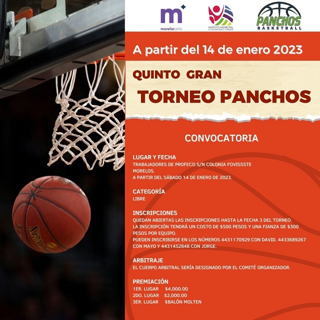El Gobierno de Morelia a cargo del presidente municipal, Alfonso Martínez Alcázar, continúa en su labor de colaborar con la reconstrucción del tejido social y fomento a la actividad física y deporte en colonias ubicadas en la periferia de la capital del estado, con la puesta en marcha de la V edición del Torneo de Basquetbol “Panchos” 2023.