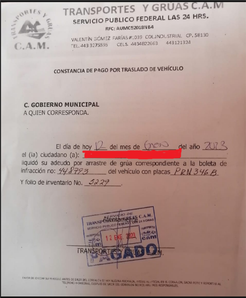 La Ley de Ingresos Municipal del 2022, no logré encontrar la del 2023, establece que el cobro por el “arrastre” con una grúa debe de ser de $627.28 (SEISCIENTOS VEINTISIETE PESOS 28/100 M.N.), empero, los propietarios de la grúas que prestan dicho servicio cobran de mil pesos para arriba y no expiden el recibo correspondiente, solo entregan al ciudadano una “constancia” de que ya pagó el servicio de arrastre con la grúa.