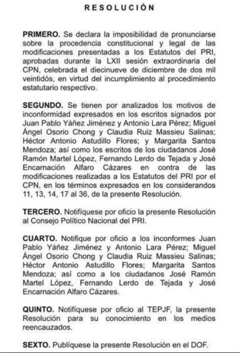 Así las cosas, en su proyecto de resolución aprobado por la citada comisión, se establece la imposibilidad de pronunciarse sobre la procedencia constitucional y legal de las modificaciones presentadas a los estatutos del PRI, aprobadas durante la celebración de la LXII sesión extraordinaria del Consejo Político Nacional celebrada el 19 de diciembre del 2022, en virtud del incumplimiento al procedimiento estatutario respectivo.