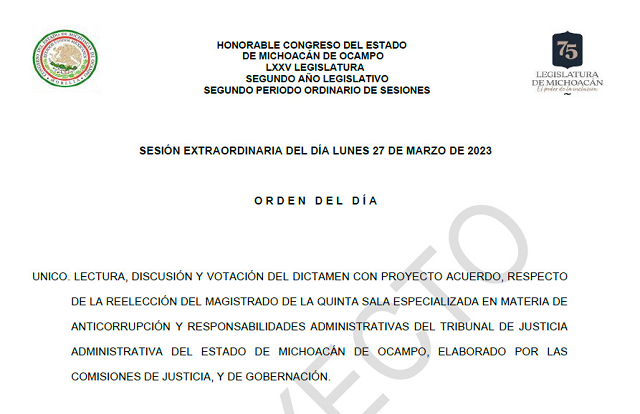De acuerdo al citatorio girado por la diputada JULIETA GARCÍA ZEPEDA presidenta de la mesa directiva del congreso estatal, los 40 integrantes de la 75 legislatura deberán sesionar de manera extraordinaria a las 18 horas de este lunes 27 de marzo, sesión cuya orden del día contempla solamente un punto: lectura, discusión y votación del dictamen con proyecto acuerdo, respecto de la reelección del magistrado de la quinta sala especializada en materia de anticorrupción y responsabilidades administrativas del TJAEM.