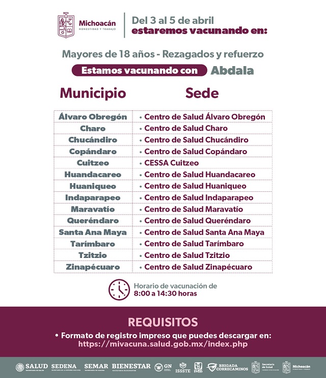 Se instalarán diversos puestos de vacunación en las ocho jurisdicciones sanitarias pertenecientes a los municipios de Angangueo, Aporo, Contepec, Epitacio Huerta, Hidalgo, Huetamo, Irimbo, Juárez, Jungapeo, Ocampo, San Lucas, Senguio, Susupuato, Tiquicheo, Tlalpujahua, Tuxpan, Tuzantla, Zitácuaro, Álvaro Obregón, Charo, Chucándiro, Copándaro, Cuitzeo, Huandacareo, Huaniqueo, Indaparapeo, Maravatío, Queréndaro, Santa Ana Maya, Tarímbaro, Tzitzio y Zinápecuaro.