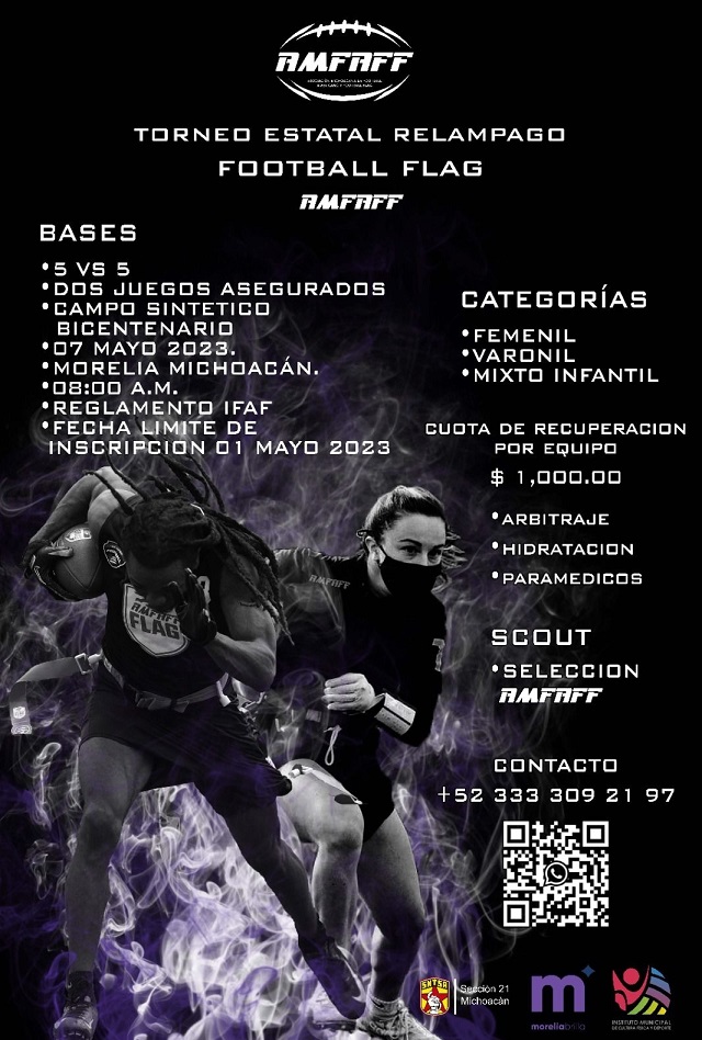 Por lo anterior y con el objetivo de promover la disciplina, el Imcufide convoca al Torneo Estatal Relámpago de Flag Football, que tendrá lugar el 7 de mayo, en el Complejo Deportivo Bicentenario.