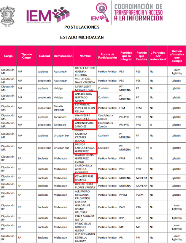 La gráfica que se presenta, es el concentrado oficial emitido por el Instituto Electoral de Michoacán, en el que se enlistan los nombres de las personas que fueron registradas por los diversos partidos político y sus coaliciones, como “candidatos” por la acción afirmativa denominada LGBTIQ+.