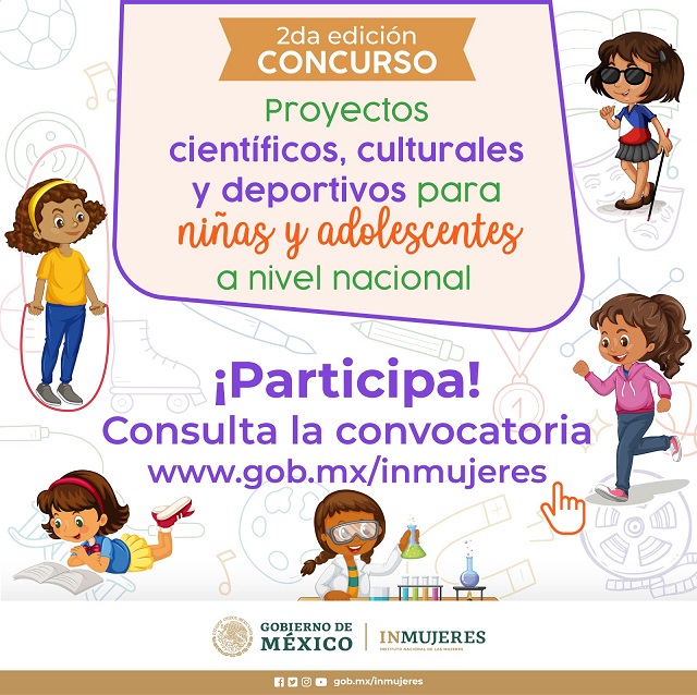 La recepción de proyectos será hasta el miércoles 9 de agosto de 2023 antes de las 23:59 horas (hora del centro del país). Para mayor Información podrán consultar la convocatoria a través del siguiente link: https://www.gob.mx/inmujeres/documentos/2-edicion-del-concurso-proyectos-cientificos-culturales-y-deportivos-para-ninas-y-adolescentes?state=published