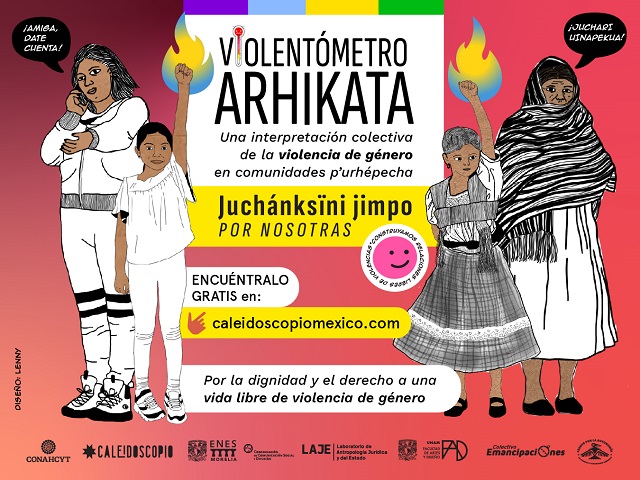 Con el fin de sumar acciones para erradicar la Violencia de Género en comunidades indígenas de la región, la Escuela Nacional de Estudios Superiores Unidad Morelia, a través del Laboratorio de Antropología Jurídica y del Estado (LAJE-UNAM) y el proyecto de ciencia de frontera Caleidoscopio (UNAM/Conahcyt), pone a disposición de las comunidades purépecha y de la sociedad en general el Violentómetro Arhikata, una interpretación de las violencias que viven algunas mujeres en las relaciones de pareja en comunidades purépecha. El instrumento toma como referencia el Violentómetro diseñado por la Unidad de Gestión con Perspectiva deGénero del Instituto PolitécnicoNacional ytiene el propósito de incidir en la identificación y hacer visibles algunas formas de violencia hacia las mujeres que en ocasiones son normalizadas y no se reconocen. Identificarlas y denunciarlas puede prevenir que la violencia escale y que la vida de las mujeres corra peligro.