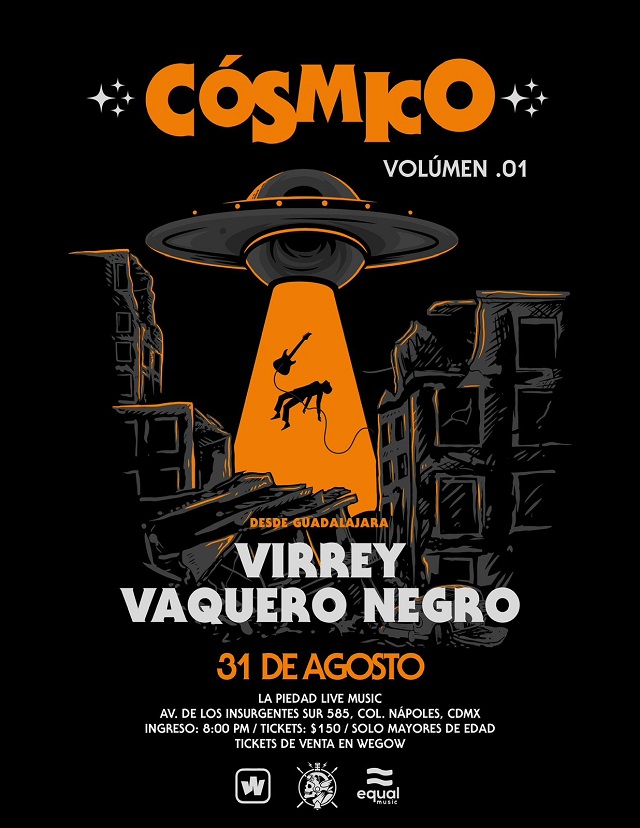 Para arrancar este par de fechas el próximo Jueves 31 de agosto en el Foro La Piedad Music Live ubicado en Av. de los Insurgentes Sur 585, Nápoles, estarán en la edición Cósmico Vol. 1: Integrado por Vaquero Negro y Virrey en concierto en punto de las 8 de la noche con un costo de boleto de $150, donde se pueden adquirir los boletos en wegow.