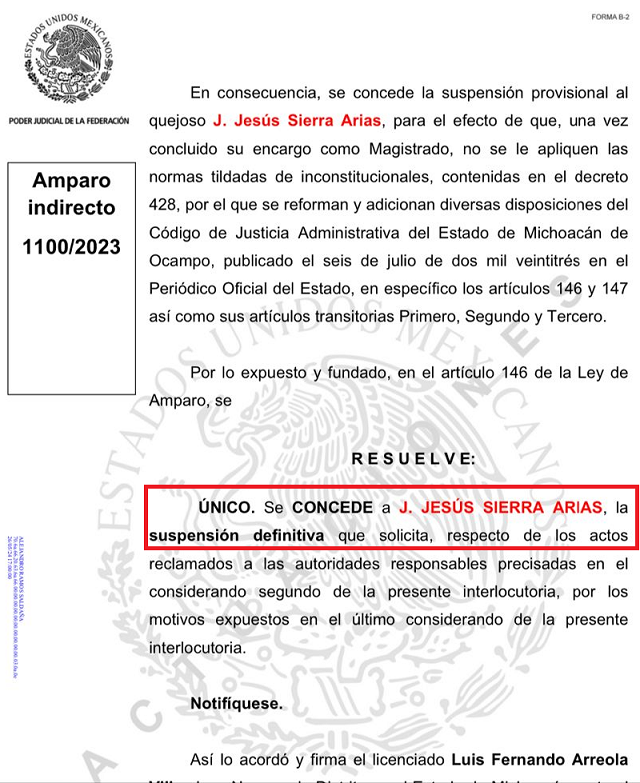 El citado juicio de amparo promovido por el magistrado del tribunal de justicia administrativa J. JESÚS SIERRA ARIAS, fue en contra de las reformas aprobadas por el pleno de la 75 legislatura al congreso del estado al Código de Justicia Administrativa del Estado de Michoacán, publicadas en el periódico oficial del gobierno del estado el pasado seis de julio de 2023.