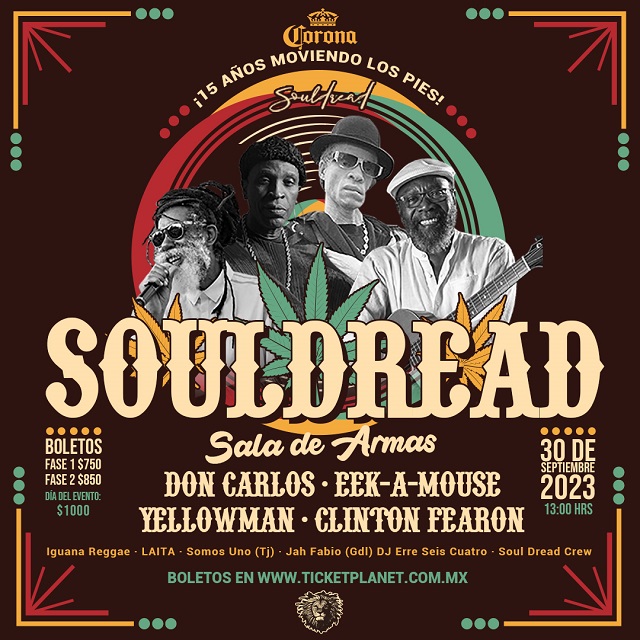 El emblemático y clásico lugar de la música reggae, Soul Dread, está a punto de cumplir una década y media de trayectoria. La celebración tendrá lugar el próximo 30 de septiembre en SALA DE ARMAS a partir de las 13:00 horas. Este evento reunirá a un impresionante elenco de leyendas del reggae jamaicano, como Don Carlos, Eek-A-Mouse, King Yellowman y Clinton Fearon, así como a talentosos artistas mexicanos como SOMOS UNOS, JAH FABIO, Iguana Reggae, Laita, Dj erre seis cuatro y el equipo de Soul Dread Crew.