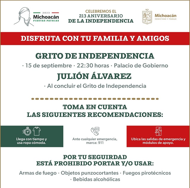 El Gobierno de Michoacán invita a la población a disfrutar en familia y amigos, la celebración del Grito, con motivo del 213 aniversario del inicio de la Independencia, así como del concierto gratuito que ofrecerá Julión Álvarez en el Centro Histórico de la capital michoacana.