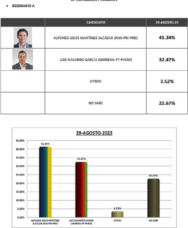 El mismo estudio demoscópico revela que, cuándo aparecen eventuales candidatos a la presidencia municipal de Morelia, los números cambian radicalmente, pues por una parte, al poner como candidato a cualquiera de los aspirantes manifiestos del partido guinda, Morena cae 8.87 puntos porcentuales con LUIS NAVARRO GARCÍA, quien obtiene 32.47% en las preferencia electorales por el 41.34% de ALFONSO MARTÍNEZ ALCÁZAR.