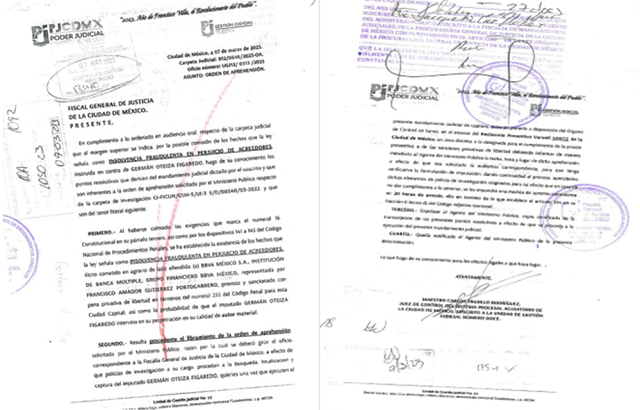 De acuerdo a la Carpeta de Investigación CI-FICUH/CUH-5/UI-3 5/D/00540/03-2022, la fiscalía obtuvo la orden de aprehensión en contra de GERMÁN OTEIZA FIGAREDO por su presunta responsabilidad en la comisión del delito de Insolvencia Fraudulenta en Perjuicio de Acreedores, a denuncia penal interpuesta por el ofendido BBVA México S.A, Institución de Banca Múltiple, Grupo Financiero BBVA México.